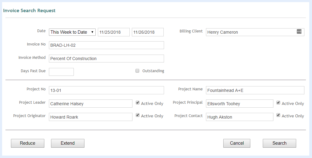 Mark this check box to retrieve only those invoices that are associated with active project leaders, originators, principals or contacts.